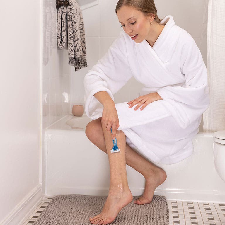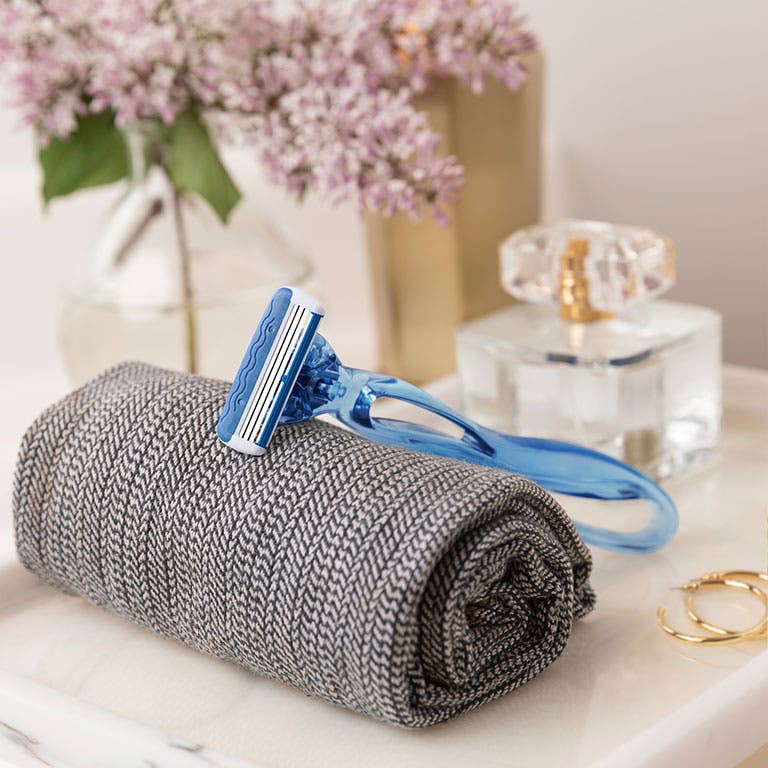 - Spécialement adapté au rasage féminin, le manche bleu incurvé de ce rasoir offre une prise en main optimale, même sur peau humide